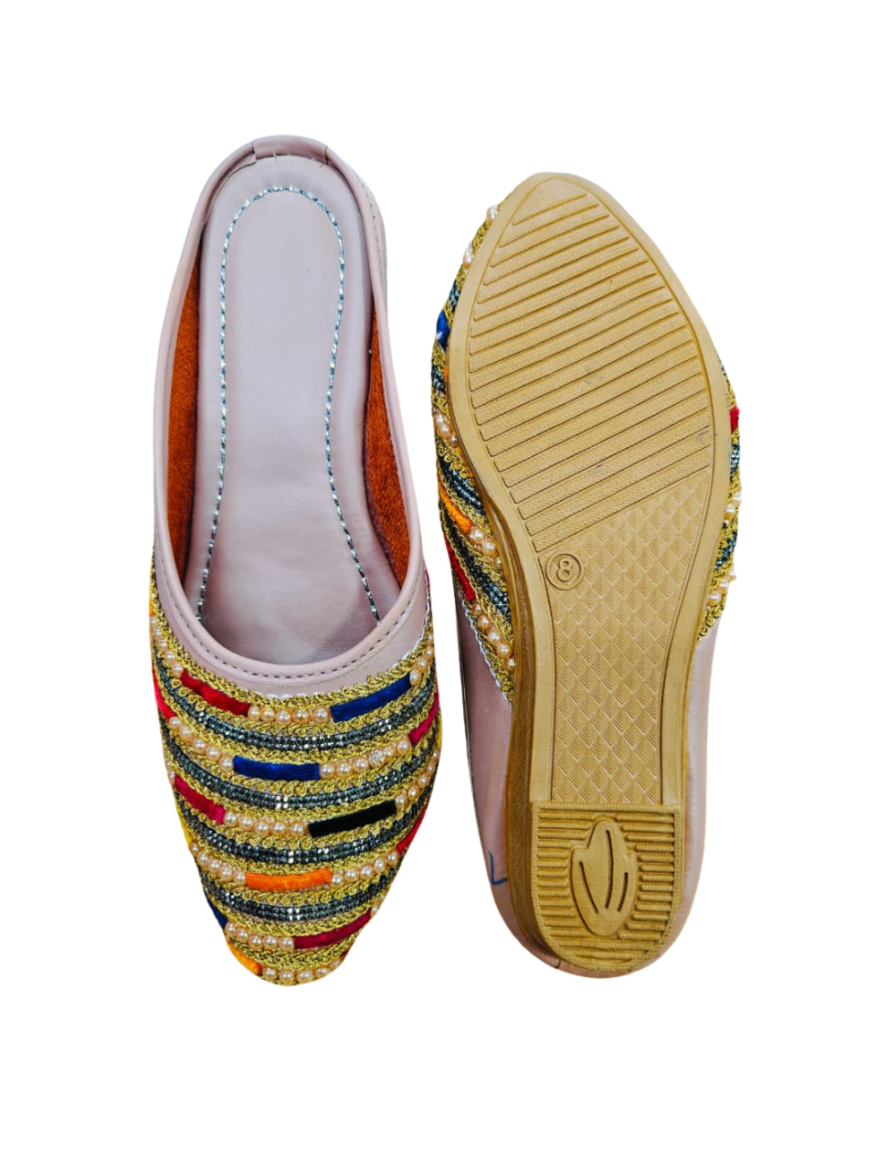 The soft pink colour brings a subtle yet luxurious appeal, making these juttis perfect for weddings, festive occasions, parties, and cultural celebrations. The cushioned insole ensures comfortable wear for long hours, while the durable sole provides stability and support.
